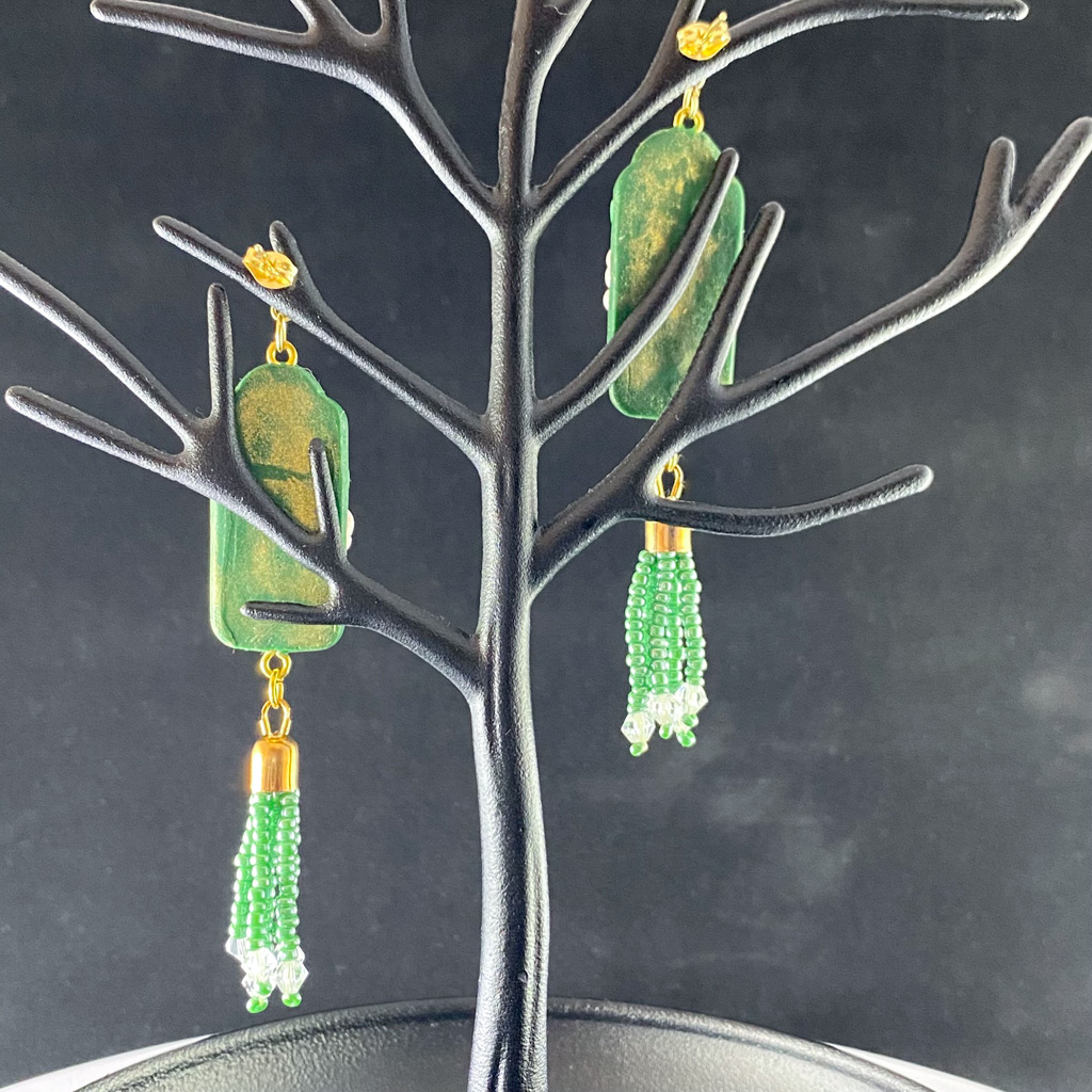 Black & Green Floral Frame Beaded Clay Earrings