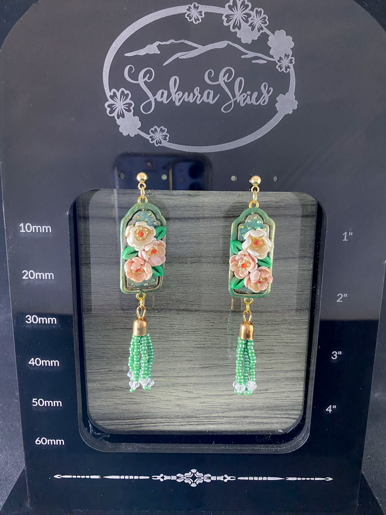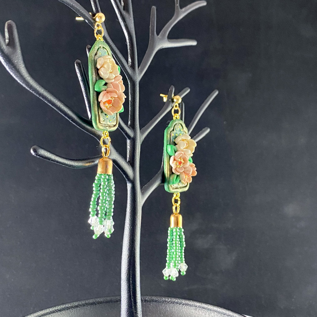 Lovingly sculpted petal by petal these lovely floral earrings are one-a-kind treasures. Featuring hand sculpted flowers on elegant gilded frames adorned with crystals, these lovely earrings shine with iridescence and gold colored accents. I design all my clay earrings with beads and other materials hand picked to coordinate, so no two sets of earrings are exactly the same. Whether you want to channel a bit of spring glamor or give someone a lovely handmade gift, you can’t go wrong with these floral frame beaded clay earrings.
