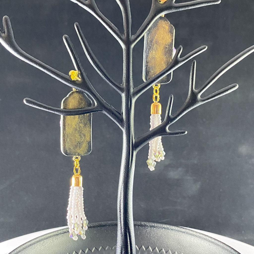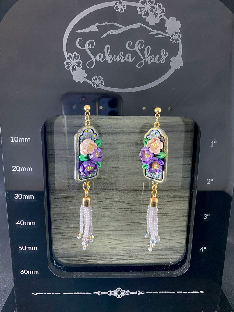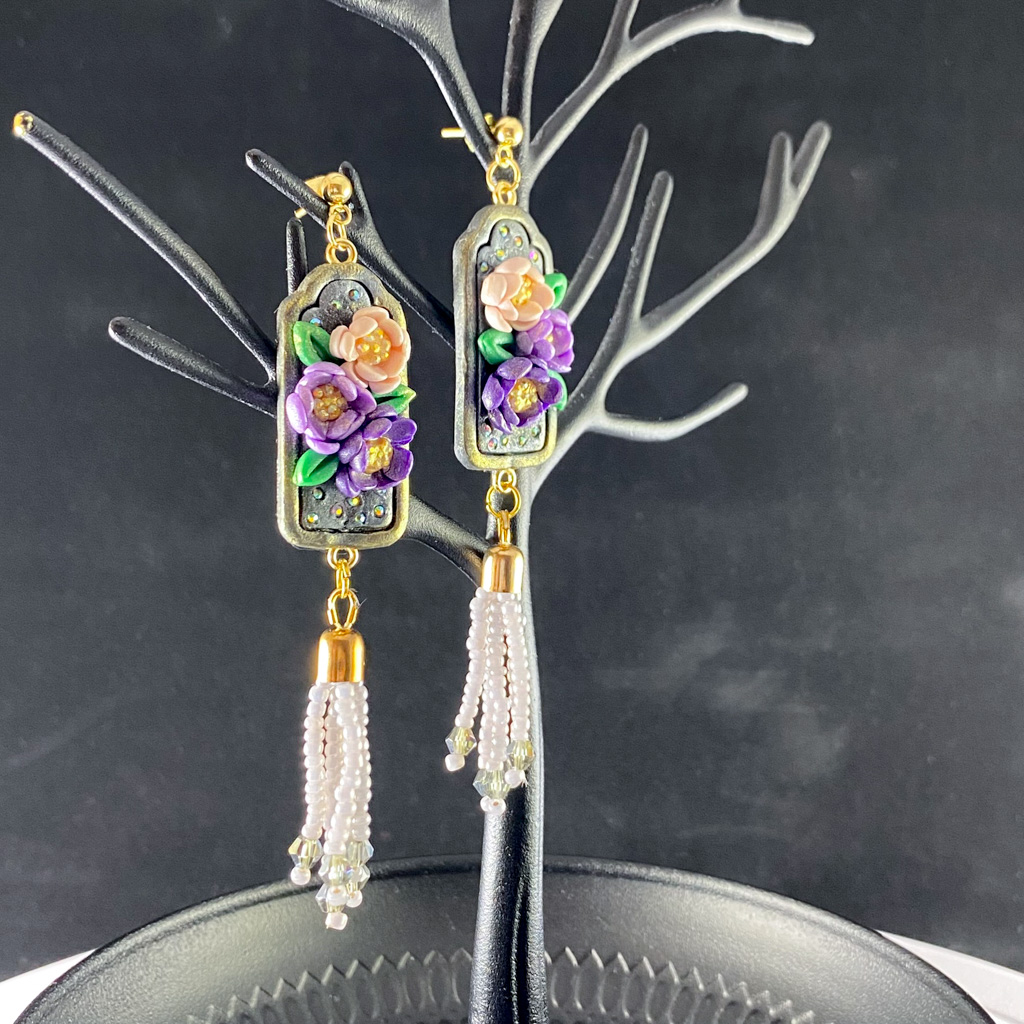 Lovingly sculpted petal by petal these lovely floral earrings are one-a-kind treasures. Featuring hand sculpted flowers on elegant gilded frames adorned with crystals, these lovely earrings shine with iridescence and gold colored accents. I design all my clay earrings with beads and other materials hand picked to coordinate, so no two sets of earrings are exactly the same. Whether you want to channel a bit of spring glamor or give someone a lovely handmade gift, you can’t go wrong with these floral frame sculpted clay dangle earrings.