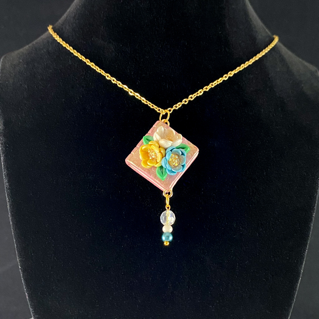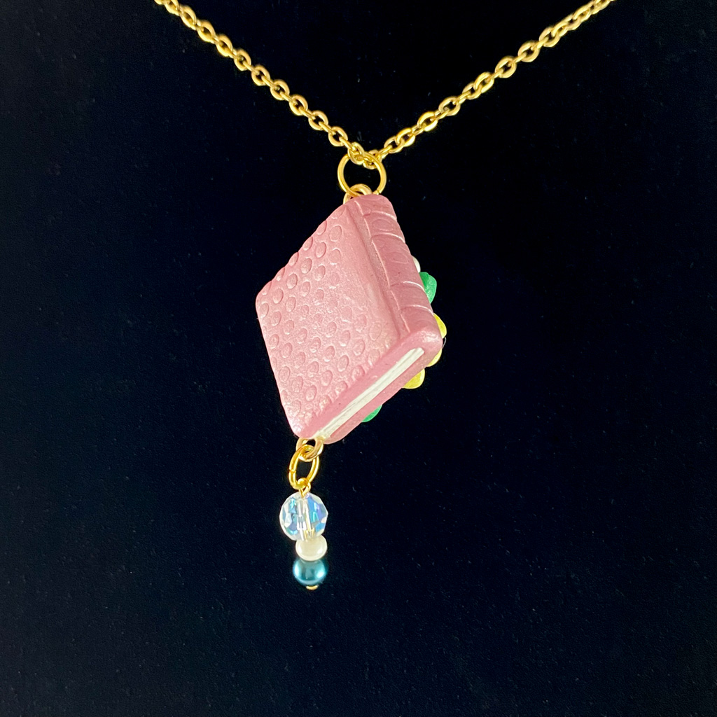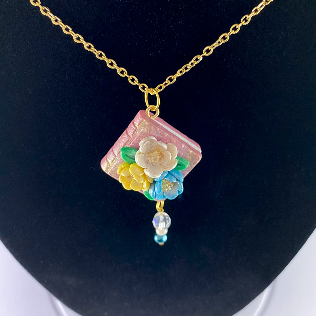 Lovingly sculpted petal by petal this lovely book blossom necklace is a one-a-kind treasure. Featuring hand sculpted flowers on elegant gilded frames adorned with crystals, this lovely necklace shines with iridescence and gold colored accents. I design all my clay necklaces with beads and other materials hand picked to coordinate, so no two necklaces are exactly the same. Whether you want to channel a bit of spring glamor or give someone a lovely handmade gift, you can’t go wrong with this book blossom sculpted clay necklace.