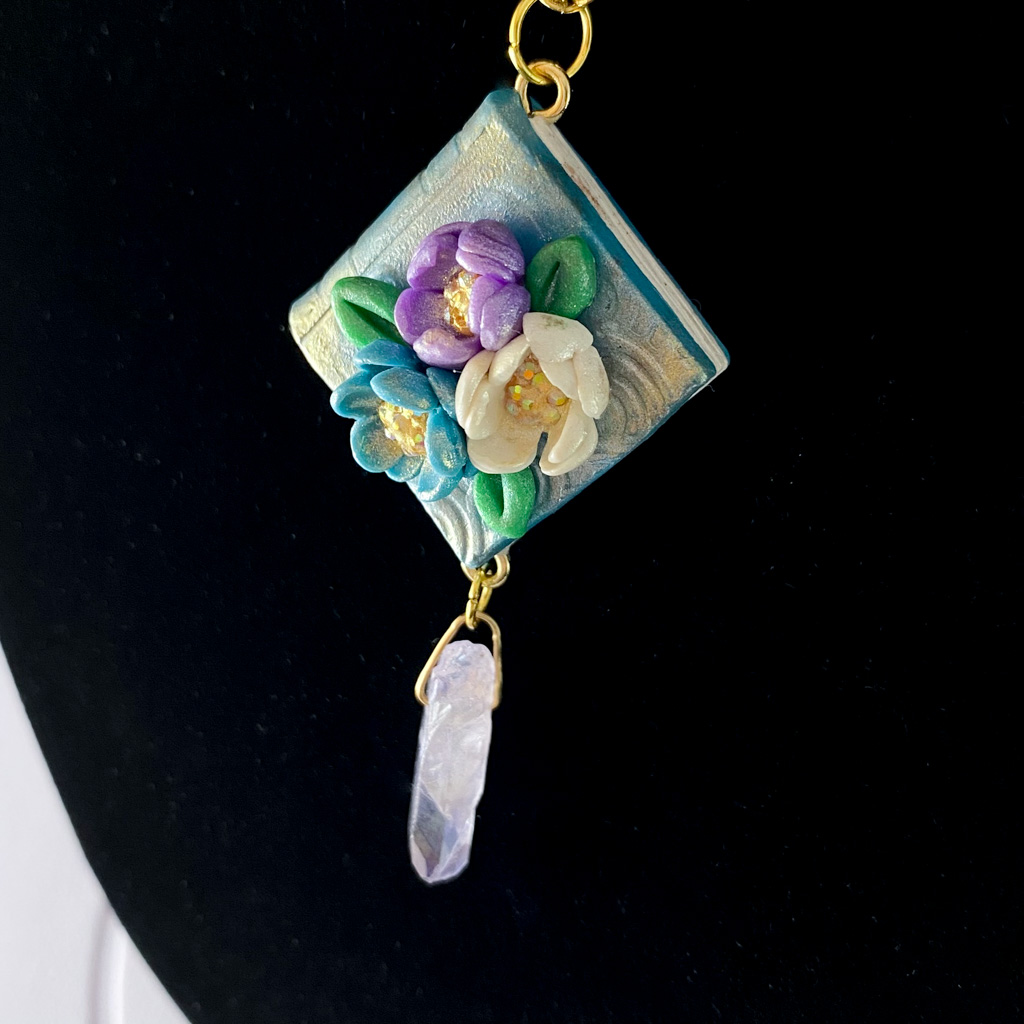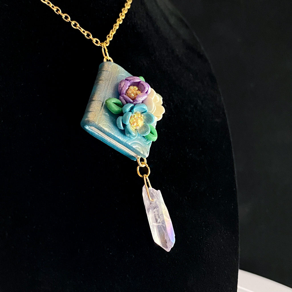 Teal Book Blossom & Crystal Sculpted Clay Necklace