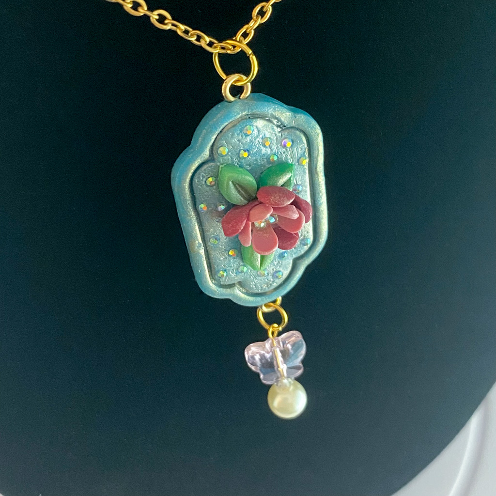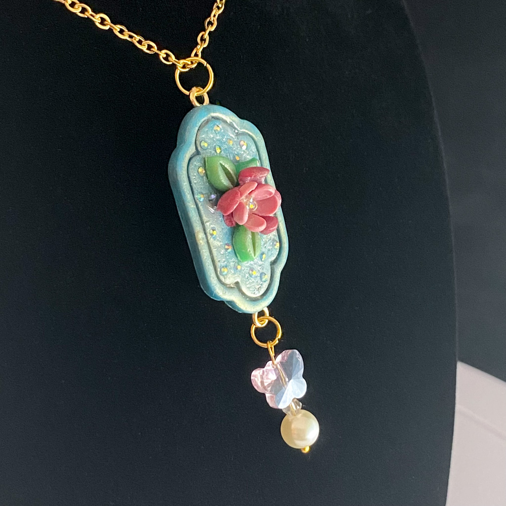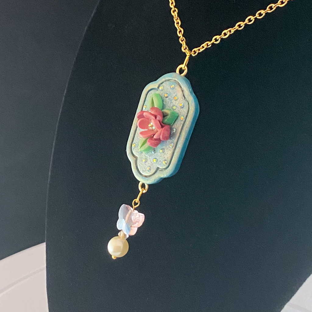 Teal & Pink Floral Frame Sculpted Clay Necklace
